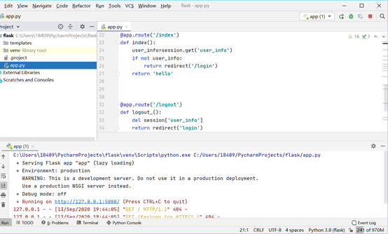 | from flask import Flask, request, redirect, render_template,session app = Flask(name) app.secret_key='QWERTYUIOP'#Encrypt user information @app.route('/login',methods=['GET',"POST" ])#Route default receiving request mode is POST, but all the requests required for login, so special statement. def login(): if request.method=='GET': return render_template('login.html') user=request.form.get('user') pwd=request.form.get('pwd') if user =='admin' and pwd=='123':#Here can be judged according to the user and password in the database, because it is the simplest login interface, the database is not very good, all useless. session['user_info']=user return redirect('/index') else: return render_template('login.html',msg='User name or password entered incorrectly') @app.route('/index') def index (): user_info=session.get('user_info') if not user_info: return redirect('/login') return'hello' @app.route('/logout') def logout_(): del session['user_info' ] return redirect('login') if name == "main": app.run() |