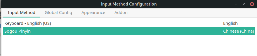 $ sudo pacman -S fcitx-sogoupinyin #Install sogoupinyin