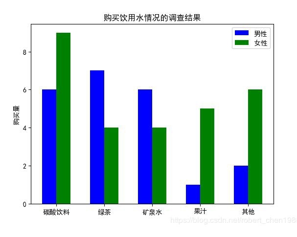 plt.xticks(index_male + bar_width/2, waters) #Let the horizontal axis scale show the drinking water in waters, index_male + bar_width/2 is the position of the horizontal axis scale